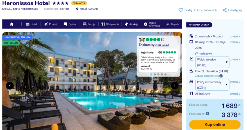 Te wyjątkowe wczasy pozwalają cieszyć się urokami greckiego miasta Hersonissos, gdzie czterogwiazdkowy Heronissos Hotel oferuje zakwaterowanie blisko piaszczystej plaży. Goście mogą korzystać z orzeźwiających kąpieli w basenie zewnętrznym otoczonym kameralnym ogrodem lub relaksować się na słonecznym tarasie. Cały pobyt przygotowano w wygodnej formule all inclusive, która obejmuje pełne wyżywienie w formie bufetu oraz szeroki wybór lokalnych napojów i przekąsek serwowanych w hotelowym barze.