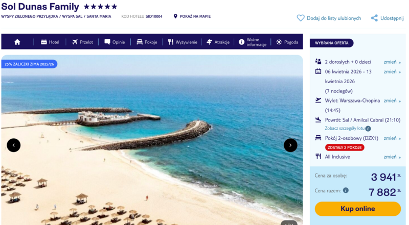 Ten wyjazd to idealna propozycja na wiosenny relaks w pięciogwiazdkowym hotelu Sol Dunas Family. Obiekt zbiera świetne recenzje dzięki bogatej infrastrukturze, w skład której wchodzą aż trzy baseny zewnętrzne oraz fantastyczny miniaquapark ze zjeżdżalniami, uwielbiany przez najmłodszych gości. Całość pobytu realizowana jest w wygodnej formule **all inclusive**, obejmującej zróżnicowane posiłki w formie bufetu, przekąski oraz szeroki wybór napojów.