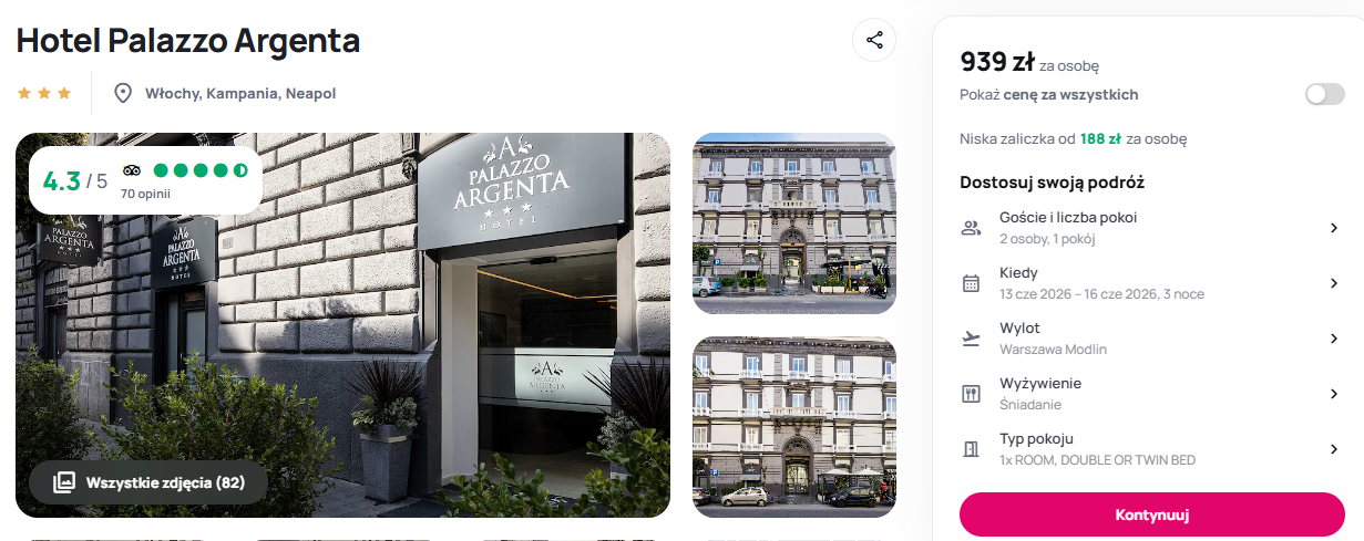 Wycieczka do Neapolu to idealna okazja, aby poczuć klimat południowych Włoch i zatrzymać się w komfortowym 3* hotelu Palazzo Argenta. Obiekt zbiera bardzo dobre recenzje, w których podróżni szczególnie chwalą wyśmienite śniadania w formie bufetu oraz niezwykle profesjonalną i przyjazną obsługę. Goście doceniają nowoczesny wystrój, czystość dźwiękoszczelnych pokoi oraz bliskość głównych zabytków.