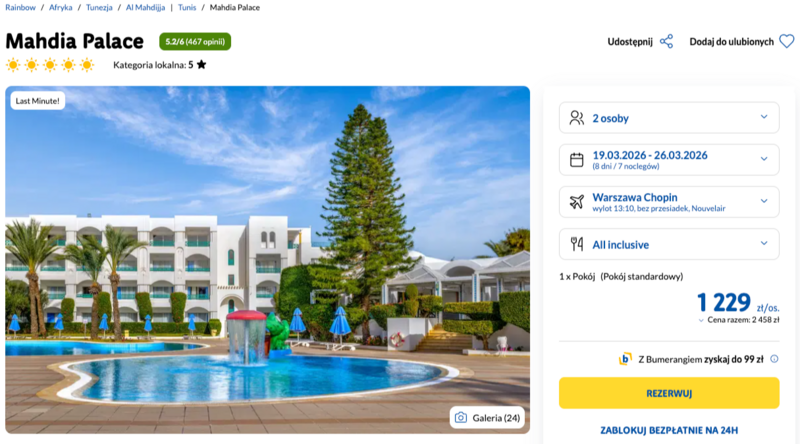 Wypoczynek w Tunezji to idealna okazja, aby zaznać relaksu w prestiżowym hotelu Mahdia Palace. Obiekt ten słynie z wyjątkowej architektury w tunezyjskim stylu oraz położenia przy jednej z najpiękniejszych, piaszczystych plaż w regionie. Goście w swoich opiniach zachwalają przede wszystkim profesjonalną obsługę, bogate animacje oraz wysoką jakość serwowanych posiłków. Wycieczka organizowana jest w formule all inclusive, co zapewnia pełen komfort i dostęp do lokalnych napojów oraz różnorodnych dań kuchni międzynarodowej i lokalnej bez żadnych limitów.