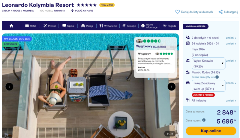 Wiosenny termin gwarantuje przyjemną aurę z temperaturami sięgającymi 20 stopni Celsjusza, co sprzyja spacerom po urokliwej miejscowości Kolymbia czy zwiedzaniu pobliskiego Lindos. Na miejscu czekają liczne atrakcje, od zajęć sportowych i kortów tenisowych, po wieczorne występy muzyczne i karaoke. Dzięki lokalizacji blisko czystej, piaszczystej plaży oraz krystalicznie błękitnej wody, odpoczynek staje się czystą przyjemnością. Całość dopełniają eleganckie pokoje, w tym luksusowe opcje z bezpośrednim dostępem do wspólnego basenu, co czyni ten wyjazd niezapomnianym przeżyciem.