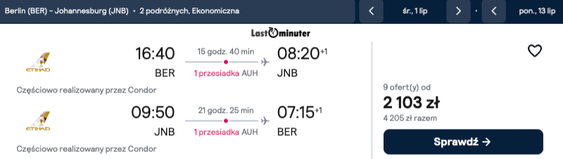 Wyjątkowo atrakcyjne połączenie lotnicze do Johannesburga jest dostępne z lotniska w Berlinie. Podróż w te rejony Afryki realizowana jest z jedną wygodną przesiadką, co pozwala na sprawny i komfortowy dolot do celu.