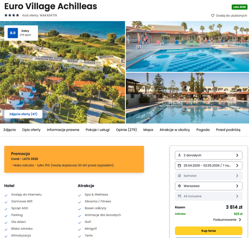 Wycieczka do czterogwiazdkowego hotelu Euro Village Achilleas pozwala na relaks w otoczeniu cedrów i drzew oliwnych, tuż przy szerokiej plaży w miejscowości Mastichari. Goście chwalą obiekt za niezwykle miłą obsługę, nienaganną czystość w pokojach oraz malownicze widoki na Morze Egejskie. Na miejscu czeka rozbudowana infrastruktura sportowa, w tym korty tenisowe i minigolf, a dla spragnionych większych wrażeń w pobliżu znajduje się słynny park wodny Lido. Wyjazd odbywa się w formule podkreślającej pełen komfort, gdyż wypoczynek zaplanowano w opcji all inclusive.