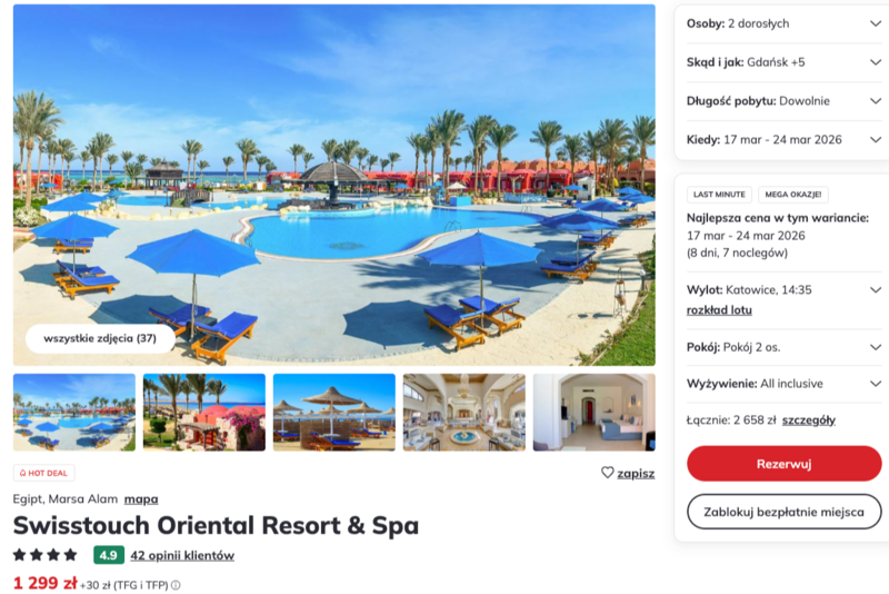 Goście wybierający te wczasy mogą liczyć na zakwaterowanie w czterogwiazdkowym hotelu Swisstouch Oriental Resort & Spa, który zachwyca nubijską architekturą i rozległym ogrodem. Obiekt oferuje bogatą ofertę all inclusive, dzięki której regionalne przysmaki oraz orzeźwiające napoje są dostępne na wyciągnięcie ręki. Wczasowicze w swoich opiniach chwalą kompleks za bliskość piaszczystej plaży z dostępem do kolorowej rafy koralowej oraz życzliwą obsługę, która dba o komfort każdego przyjezdnego.