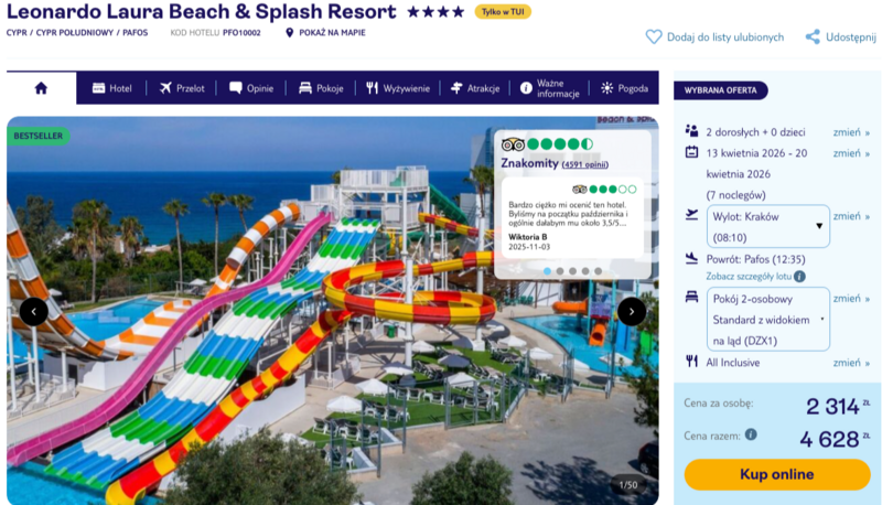 Wiosenne wczasy w Pafos to idealny moment na odkrywanie uroków Cypru. Zakwaterowanie przewidziano w nowoczesnym hotelu Leonardo Laura Beach & Splash Resort, który zbiera znakomite opinie od odwiedzających. Goście szczególnie chwalą hotelowy aquapark z pięcioma zjeżdżalniami oraz profesjonalną obsługę, która dba o każdy szczegół wypoczynku. Wyjazd ten jest realizowany w formule all inclusive, co oznacza nieograniczony dostęp do urozmaiconych posiłków, przekąsek takich jak świeża pizza czy lody, a także szerokiego wyboru napojów.