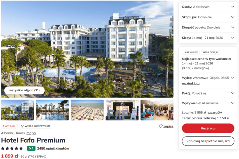 Podczas pobytu w pięciogwiazdkowym obiekcie Fafa Premium w Durres wypoczywa się bezpośrednio przy szerokiej, piaszczystej plaży z bezpłatnym serwisem. Goście chwalą nowoczesny design pokoi oraz uprzejmość personelu, który dba o każdy detal. Całość wyjazdu realizowana jest w formie bogatego all inclusive, co zapewnia pełen komfort i dostęp do smacznej kuchni albańskiej oraz międzynarodowej bez dodatkowych zmartwień o posiłki czy napoje.