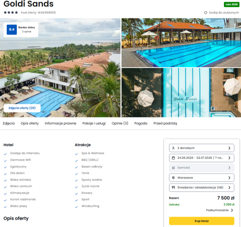 Wyloty z Warszawy i Krakowa. Tajemnicza Sri Lanka zaprasza do Zachodniej Prowincji, gdzie w miejscowości Negombo czeka czterogwiazdkowy hotel Goldi Sands. Obiekt ten słynie z niesamowitego położenia tuż przy piaszczystej plaży oraz bliskości lotniska, co pozwala na błyskawiczny relaks po dotarciu na miejsce.