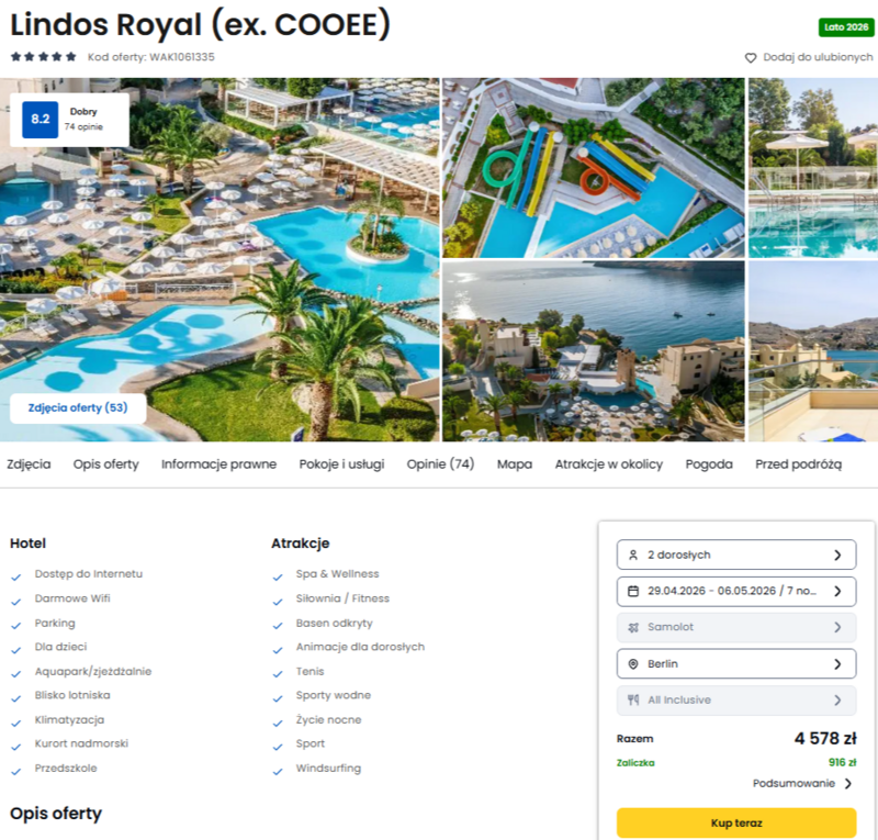 Wypoczynek w pięciogwiazdkowym hotelu Lindos Royal, położonym na malowniczym wzgórzu tuż przy zatoce, zapewnia niezapomniane widoki na Morze Egejskie. Goście często chwalą ten obiekt za niezwykle miłą obsługę oraz doskonałą kuchnię serwowaną w aż czterech restauracjach tematycznych. Wycieczka realizowana jest w formule all inclusive, co pozwala na nielimitowane korzystanie z lokalnych napojów oraz różnorodnych posiłków w formie bufetu i przekąsek w ciągu dnia. Na miejscu czekają trzy baseny z kaskadami oraz park wodny ze zjeżdżalniami, które są gwarancją świetnej zabawy dla każdego.