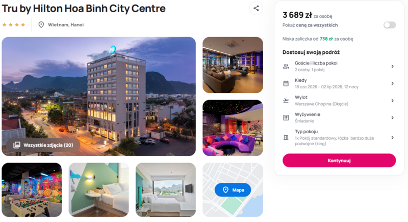 Te wyjątkowe wczasy pozwalają na relaks w nowoczesnym, czterogwiazdkowym hotelu Tru by Hilton Hoa Binh City Centre, położonym w malowniczym mieście Hoa Binh. Na miejscu czeka na gości bogata oferta udogodnień, w tym całodobowa siłownia, strefa rozrywki oraz wyśmienite śniadania w formie bufetu. Użytkownicy w swoich opiniach doceniają profesjonalną, wielojęzyczną obsługę oraz wysoki standard pokoi wyposażonych w bardzo duże, wygodne łóżka.