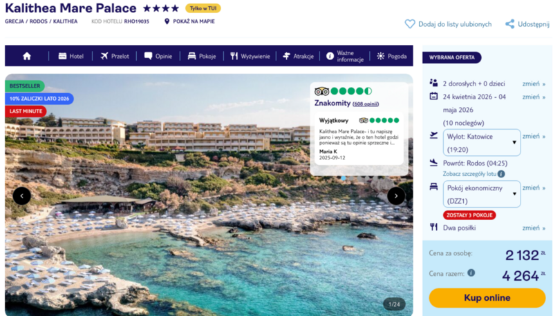 Wczasy w czterogwiazdkowym hotelu Kalithea Mare Palace to propozycja dla osób pragnących wypoczynku w otoczeniu zieleni i błękitu morza. Obiekt położony jest na wzgórzu, tuż powyżej urokliwej, prywatnej zatoki, która według opinii gości stanowi idealne miejsce do pływania i podziwiania podwodnego świata. Użytkownicy chwalą bogate menu z owocami morza i lokalnymi przysmakami oraz profesjonalną obsługę, wspominając o wyjątkowo sympatycznym szefie plaży.