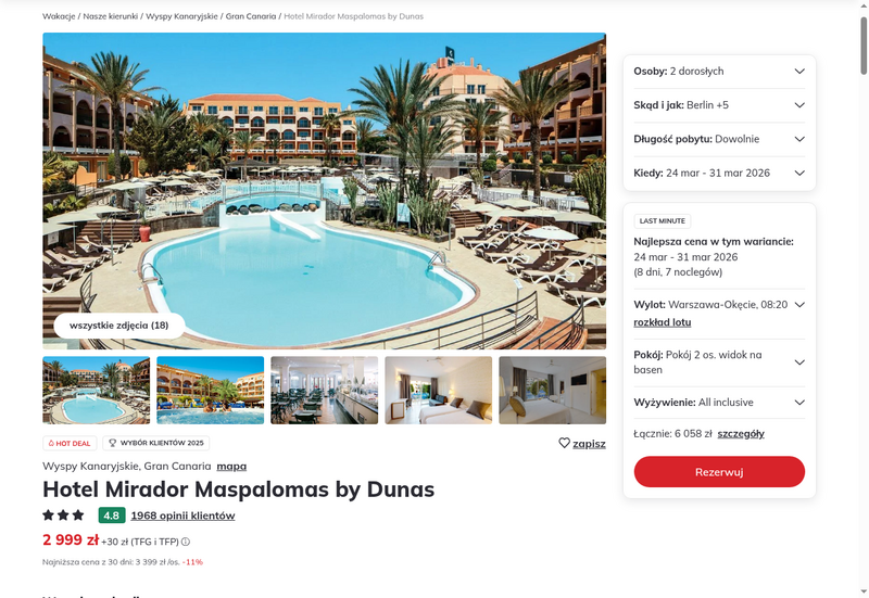 Aktualizacja: Wyspy Kanaryjskie (Gran Canaria) last minute: 3* hotel z all inclusive za 2099 zł
