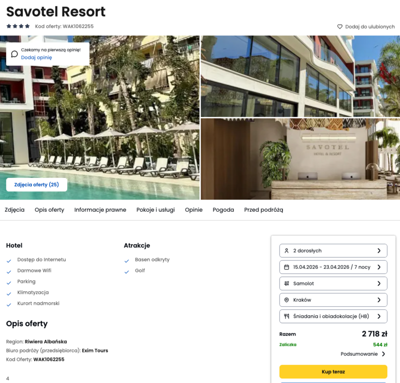 Oferty wycieczek dostarczone przez naszych partnerów nie są aktualizowane w czasie rzeczywistym, w związku z czym ceny i dostępność ofert mogą się nieznacznie różnić od aktualnych. Dokładamy wszelkich starań aby rozbieżności były jak najmniejsze.