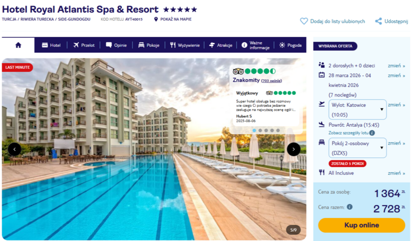 Pięciogwiazdkowy Hotel Royal Atlantis Spa & Resort to miejsce, które zachwyca gości przede wszystkim wyśmienitą kuchnią oraz profesjonalną obsługą. Wypoczynek umilają puszyste, wygodne łóżka w klimatyzowanych pokojach oraz bezpośrednie sąsiedztwo piaszczystej plaży z łagodnym wejściem do morza. Użytkownicy w swoich opiniach często podkreślają, że cała podróż odbywa się w niezwykle komfortowej formule all inclusive, dzięki której smaczne posiłki i orzeźwiające napoje są dostępne na wyciągnięcie ręki przez cały dzień.