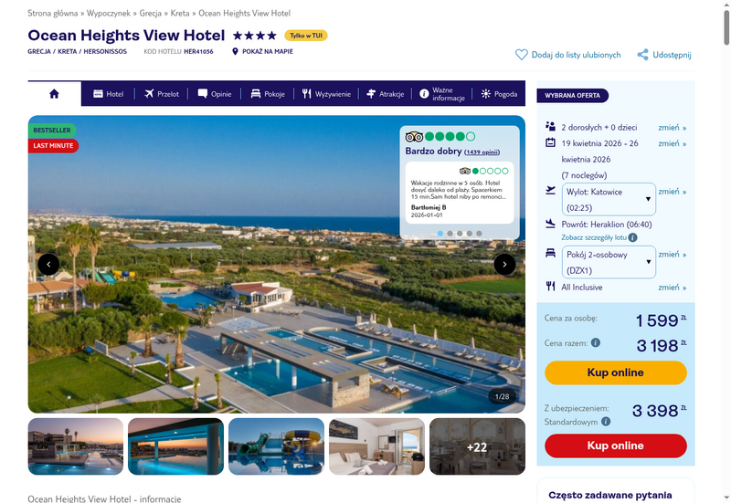 Te wiosenne wczasy pozwalają cieszyć się temperaturami sięgającymi 20 stopni Celsjusza, co sprzyja zarówno wypoczynkowi przy basenie, jak i odkrywaniu uroków pobliskiego Hersonissos czy zabytkowego Heraklionu. Hotel Ocean Heights View, malowniczo położony na wzgórzu, oferuje gościom bogatą formułę all inclusive, dzięki której można bez ograniczeń kosztować lokalnych przysmaków oraz międzynarodowych dań w formie bufetu.