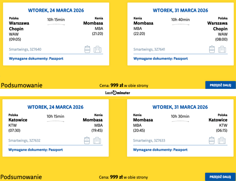 Połączenia lotnicze z Warszawy i Katowic pozwalają na szybkie i komfortowe dotarcie do słonecznej Mombasy. Ta wyjątkowa okazja cenowa stanowi doskonały pretekst do zaplanowania egzotycznego wypoczynku w Afryce.