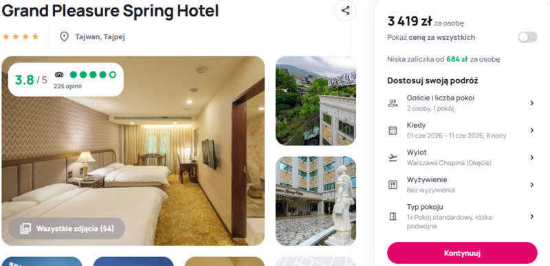 Podczas pobytu domem stanie się czterogwiazdkowy Grand Pleasure Spring Hotel, położony w urokliwej dzielnicy Beitou. Obiekt zbiera pozytywne recenzje głównie za dostęp do prywatnych kąpieli w wodach termalnych oraz bliskość Parku Narodowego Jangmingszan. Goście chwalą hotel za relaksującą atmosferę i pomocną obsługę, a także możliwość regeneracji w przestronnych wannach z naturalną wodą źródlaną. To idealna baza wypadowa do zwiedzania słynnego nocnego targu w Shilin czy podziwiania panoramy miasta z tarasu wieżowca Tajpej 101.