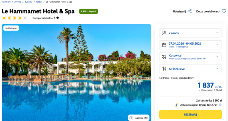 Misją Lastminuter.pl jest przedstawienie Ci najlepszych zdaniem naszej redakcji okazji na podróże. Opisujemy oferty znalezione przez nas w internecie i wskazujemy adresy internetowe, pod którymi samodzielnie możesz wykupić podróż lub elementy podróży. Ceny w artykułach są aktualne w chwili publikacji. Możemy otrzymywać wynagrodzenie od partnerów handlowych, do których Cię przekierowujemy. Nie ma to wpływu na cenę Twojej wycieczki. Powielanie publikacji zabronione.