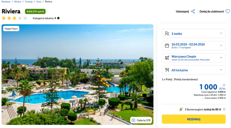Ten wyjazd pozwala cieszyć się relaksem w trzygwiazdkowym hotelu Riviera, który goście chwalą za bliskość przepięknej plaży Port El Kantaoui oraz doskonałą atmosferę. Wypoczynek umilają dzienne i wieczorne animacje, a miłośnicy aktywnego spędzania czasu chętnie korzystają z mini golfa czy gimnastyki przy basenie. Użytkownicy w swoich opiniach często podkreślają profesjonalizm zespołu animatorów oraz wyśmienite ciasta serwowane w restauracji głównej. Wycieczka zapewnia pełen komfort, ponieważ jest realizowana w opcji all inclusive, co obejmuje zarówno główne posiłki, jak i napoje.