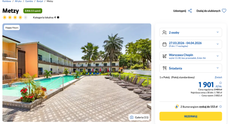 Ten afrykański kraj przywita podróżnych wyśmienitą pogodą, oferując w tym czasie aż dziesięć godzin pełnego słońca w ciągu dnia oraz przyjemną temperaturę wody w oceanie, sięgającą dwudziestu dwóch stopni Celsjusza. Zakwaterowanie w czterogwiazdkowym hotelu Metzy zapewnia doskonałą bazę wypadową do odkrywania uroków Serrekundy. Obiekt wyróżnia się niezwykle przyjazną obsługą oraz położeniem w tropikalnej zieleni, zaledwie kilkaset metrów od szerokiej, piaszczystej plaży. Użytkownicy w swoich opiniach doceniają panujący tu spokój oraz bliskość tętniącej życiem ulicy Senegambia, gdzie czekają lokalne restauracje i muzyka na żywo.