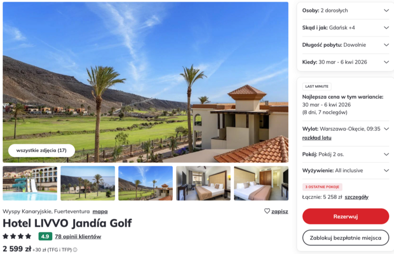Ten wyjątkowy wyjazd do czterogwiazdkowego hotelu LIVVO Jandía Golf to idealna propozycja dla osób pragnących relaksu w malowniczym otoczeniu. Goście mogą liczyć na zakwaterowanie w niezwykle przestronnych apartamentach z salonami, co w połączeniu z bogatą formułą all inclusive, zapewnia pełen komfort bez dodatkowych zmartwień o wyżywienie czy napoje. Obiekt przyciąga pozytywnymi opiniami dotyczącymi urozmaiconej kuchni kanaryjskiej oraz serdecznej obsługi, która dba o rodzinną atmosferę podczas wieczornych animacji.