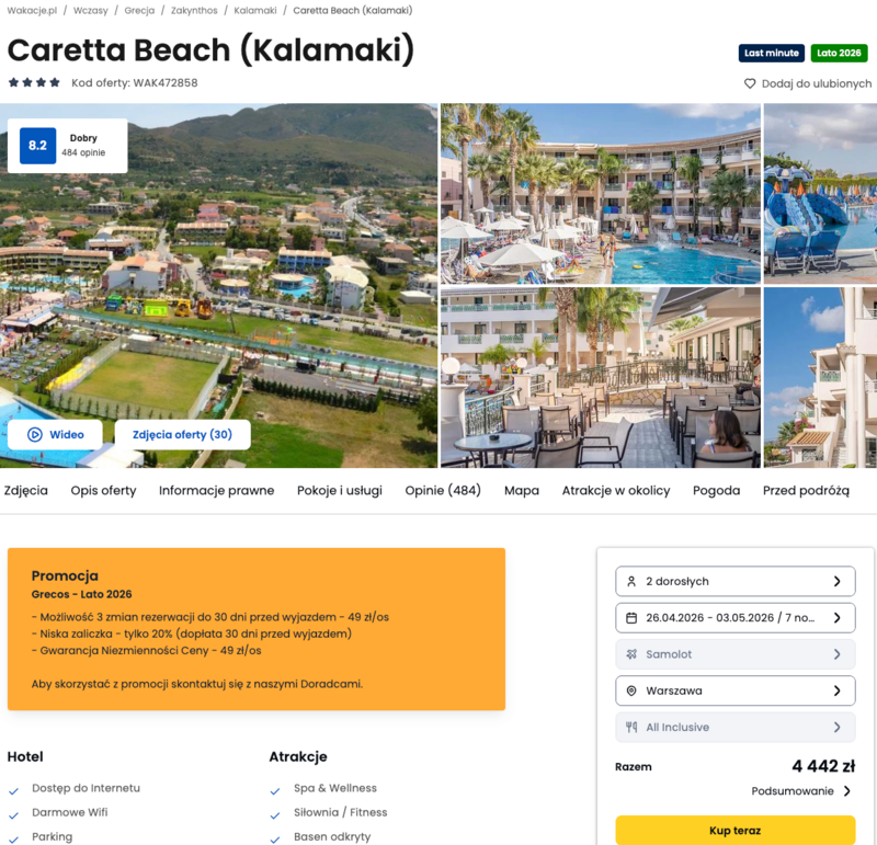 Wycieczka do czterogwiazdkowego hotelu Caretta Beach w miejscowości Kalamaki gwarantuje moc atrakcji dla całej rodziny, co potwierdzają liczne pozytywne opinie gości. Na miejscu można korzystać z fantastycznego parku wodnego ze zjeżdżalniami, sztuczną falą oraz leniwą rzeką. Obiekt położony jest w wyjątkowym sąsiedztwie Parku Narodowego, gdzie przy odrobinie szczęścia udaje się spotkać żółwie morskie. Cały wyjazd odbywa się w wygodnej formule all inclusive, dzięki której bogate bufety, przekąski i lokalne napoje są dostępne bez ograniczeń.