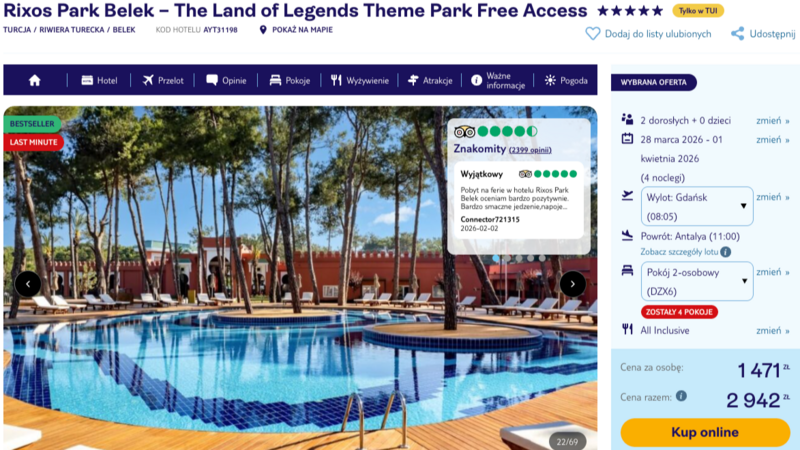 Pobyt w pięciogwiazdkowym hotelu Rixos Park Belek to gwarancja wypoczynku na najwyższym poziomie, co potwierdzają liczne opinie zadowolonych gości. Użytkownicy szczególnie chwalą urozmaicone posiłki, europejskie napoje oraz profesjonalną obsługę, która dba o każdy szczegół. Wyjazd odbywa się w formule all inclusive, co pozwala na nielimitowane korzystanie z doskonałej kuchni i szerokiego wyboru napojów bez żadnych zmartwień o dodatkowe koszty.