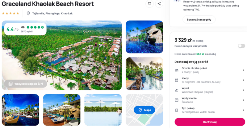 Celem podróży jest prestiżowy, pięciogwiazdkowy hotel Graceland Khaolak Beach Resort, który cieszy się znakomitymi opiniami gości. Użytkownicy szczególnie chwalą niezwykle profesjonalną i serdeczną obsługę oraz bezpośrednie sąsiedztwo prywatnej, piaszczystej plaży. Na miejscu czekają eleganckie pokoje z widokiem na basen, rozbudowana strefa spa oraz liczne udogodnienia sportowe, takie jak korty tenisowe i nowoczesna siłownia.