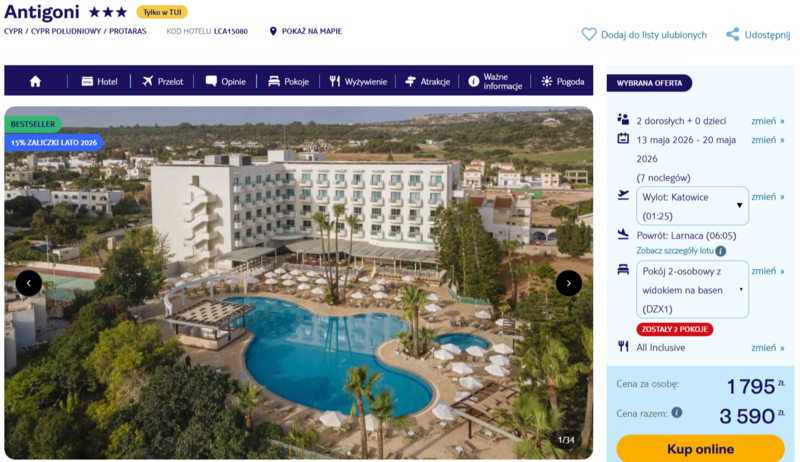 Ten wyjazd to idealna okazja, aby zamieszkać w samym centrum tętniącego życiem Protaras. Hotel Antigoni cieszy się mianem bestsellera, co potwierdzają pozytywne opinie gości doceniających bliskość lokalnych tawern i sklepów. Na miejscu czekają trzy baseny oraz bogate zaplecze sportowe, w tym siłownia i kort tenisowy. Całość wyjazdu przygotowano w komfortowej opcji all inclusive, co pozwala na nielimitowane korzystanie z bufetów, przekąsek oraz lokalnych napojów bez obaw o dodatkowe koszty.