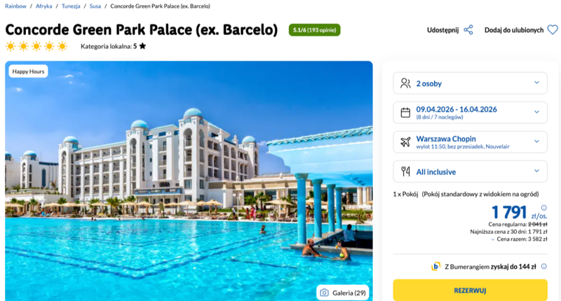 Pobyt w obiekcie Concorde Green Park Palace w Susie to gwarancja najwyższego standardu, co potwierdzają liczne opinie zadowolonych gości, chwalących przestronne pokoje oraz uśmiechniętą obsługę. Wycieczka odbywa się w formule all inclusive, obejmującej bogate bufety dań kuchni lokalnej i międzynarodowej, przekąski oraz orzeźwiające napoje serwowane przez niemal całą dobę. Na miejscu można korzystać z ogromnego basenu o powierzchni 1500 metrów kwadratowych, kortów tenisowych oraz profesjonalnych animacji, które umilają czas zarówno za dnia, jak i wieczorami.