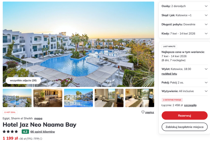 Wybór pada na czterogwiazdkowy hotel JAZ Neo Naama Bay, który słynie z doskonałego położenia w samym sercu rozrywkowej dzielnicy. Goście szczególnie doceniają urozmaicone posiłki oraz profesjonalną obsługę, a relaks zapewnia basen o nieregularnym kształcie, który w chłodniejsze dni jest podgrzewany. Cały wyjazd odbywa się w wygodnej formule all inclusive, co gwarantuje dostęp do lokalnych napojów i smacznej kuchni przez cały dzień bez dodatkowych zmartwień.