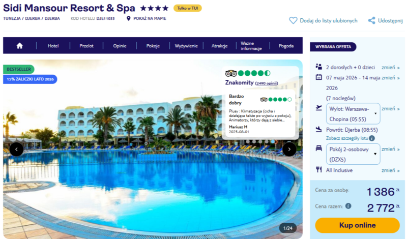 Ten tunezyjski kierunek przyciąga turystów spragnionych ciepła, oferując w tym czasie bardzo przyjemne temperatury sięgające 26 stopni Celsjusza. Pobyt w czterogwiazdkowym hotelu Sidi Mansour Resort & Spa pozwala na pełen relaks w otoczeniu orientalnej architektury. Obiekt wyróżnia się przede wszystkim imponującym basenem o powierzchni 800 metrów kwadratowych oraz profesjonalnym zespołem animatorów, którzy dbają o dobrą zabawę gości. Całości dopełnia piaszczysta plaża, oddalona o krótki spacer, gdzie można skorzystać z przejażdżki na wielbłądzie.