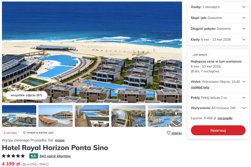 Luksusowe wczasy na rajskiej wyspie Sal startują bezpośrednio z lotniska Warszawa-Okęcie. Ten nowoczesny, pięciogwiazdkowy obiekt Royal Horizon Ponta Sino, otwarty w 2025 roku, gwarantuje najwyższy standard wypoczynku bezpośrednio przy szerokiej, piaszczystej plaży. Całość wyjazdu realizowana jest w bogatej opcji all inclusive, co pozwala cieszyć się lokalnymi przysmakami i orzeźwiającymi koktajlami przez całą dobę bez żadnych zmartwień.