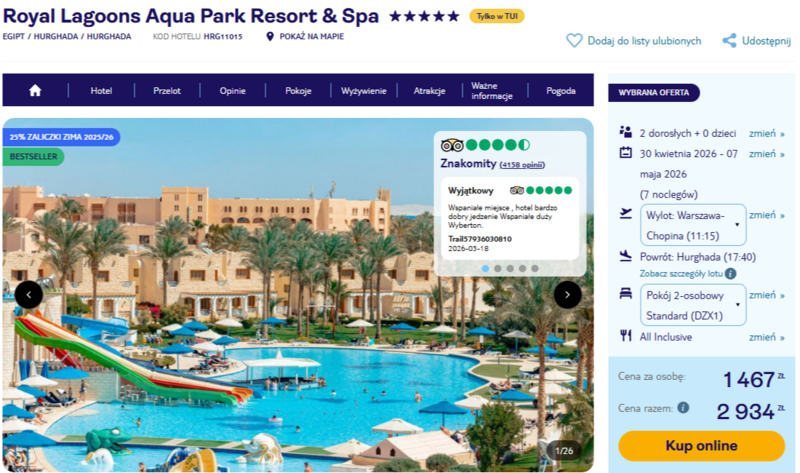 Egipt w tym terminie przyciąga doskonałą pogodą, oferując temperaturę powietrza sięgającą 29 stopni Celsjusza, co gwarantuje udany wypoczynek nad brzegiem morza. Zakwaterowanie przewidziano w pięciogwiazdkowym obiekcie Royal Lagoons Aqua Park Resort & Spa w Hurghadzie, który cieszy się znakomitymi opiniami użytkowników. Goście doceniają przede wszystkim wyjątkową obsługę, przytulny wystrój oraz pięknie utrzymany, rozległy ogród.