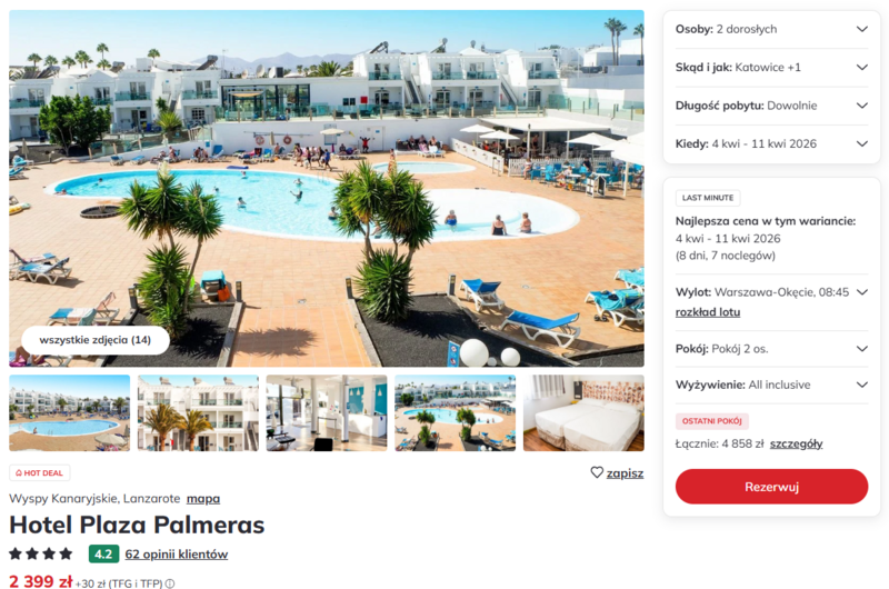 Podczas wypoczynku w czterogwiazdkowym Hotelu Plaza Palmeras można liczyć na pełen relaks, gdyż wycieczka jest w opcji all inclusive. Goście chwalą obiekt przede wszystkim za wyśmienitą, urozmaiconą kuchnię z pokazami gotowania na żywo oraz niezwykle miłą i pomocną obsługę. Położenie hotelu w popularnym kurorcie Puerto del Carmen pozwala na szybkie dotarcie do piaszczystej plaży oraz tętniącej życiem promenady z licznymi sklepami.