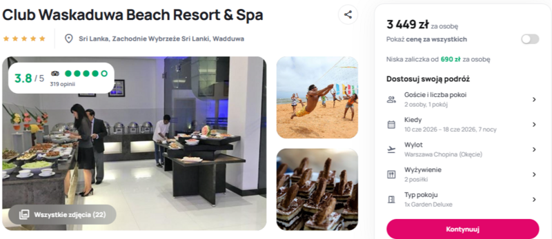 Relaks zaplanowano w pięciogwiazdkowym obiekcie Club Waskaduwa Beach Resort & Spa, położonym bezpośrednio przy piaszczystej plaży w miejscowości Wadduwa. Goście mogą liczyć na zakwaterowanie w przestronnych pokojach typu deluxe z widokiem na ogród oraz wyżywienie obejmujące dwa posiłki dziennie. Na miejscu czekają baseny, centrum odnowy biologicznej oraz liczne atrakcje sportowe, takie jak siatkówka plażowa czy jazda konna.