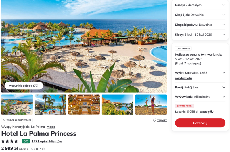 Wczasy na kanaryjskiej wyspie La Palma pozwalają przenieść się do świata egzotycznej roślinności i wulkanicznych krajobrazów. Goście mają do dyspozycji komfortowy, czterogwiazdkowy Hotel La Palma Princess, który przypomina uroczą lokalną wioskę. Całość wyjazdu przygotowano w wygodnej formule all inclusive, co gwarantuje pełne wyżywienie, przekąski oraz lokalne napoje bez dodatkowych kosztów. Użytkownicy w swoich opiniach zachwalają przede wszystkim rozbudowany kompleks sześciu basenów oraz wyśmienitą, urozmaiconą kuchnię, w której królują świeże warzywa i owoce morza.