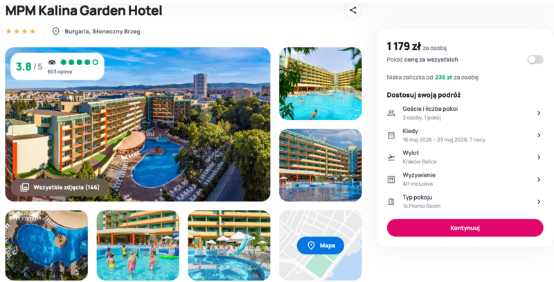 Zakwaterowanie przewidziano w nowoczesnym MPM Kalina Garden Hotel, który zlokalizowany jest blisko słynnego kurortu Słoneczny Brzeg oraz urokliwego, historycznego Nesebyru. Obiekt oferuje przestronne, klimatyzowane pokoje z balkonami oraz dostęp do licznych rozrywek, takich jak całodobowa siłownia, mini-golf czy profesjonalne animacje. Goście cenią to miejsce za świetny stosunek jakości do ceny oraz różnorodne posiłki serwowane w kompleksowej formule _all inclusive_. Dla najmłodszych przygotowano brodzik oraz klub dziecięcy, co zapewnia rodzicom chwilę wytchnienia.
