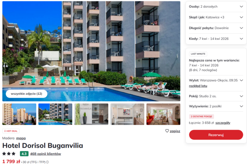 Propozycja pobytu w 3* hotelu Dorisol Buganvilia, który stanowi doskonałą bazę wypadową do zwiedzania urokliwego Funchal. Obiekt przyciąga pozytywnymi opiniami dotyczącymi pysznego, urozmaiconego wyżywienia, w tym lokalnych specjałów takich jak pałasz czarny z bananami. Goście doceniają dostęp do bogatej infrastruktury, w tym krytego, podgrzewanego basenu oraz kortów tenisowych. Pokoje wyposażone w aneks kuchenny są chwalone za funkcjonalność i codzienną czystość.