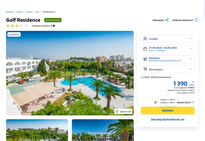 Ten wyjazd pozwala poczuć egzotyczny klimat w popularnej miejscowości Susa, a konkretnie w turystycznej dzielnicy Port el Kantoui. Noclegi przewidziano w hotelu Golf Residence, który zbiera pozytywne recenzje za świetną lokalizację blisko portu jachtowego i wesołego miasteczka. Wczasowicze chwalą obiekt za czystość oraz wspaniałą pracę animatorów, którzy dbają o dobrą zabawę gości. Wycieczka odbywa się w formule all inclusive, co zapewnia pełną wygodę i dostęp do lokalnych przysmaków oraz napojów bez dodatkowych zmartwień o budżet na miejscu.