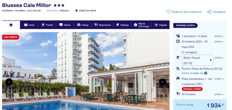 Tym razem wybór pada na 3* hotel Bluesea Cala Millor, który położony w samym sercu tętniącego życiem kurortu, zaledwie kilka kroków od piaszczystej plaży. Na miejscu czeka basen zewnętrzny z leżakami oraz jasne, komfortowe pokoje z balkonami. Podróżni doceniają ten obiekt za świetną lokalizację, bliskość licznych barów i sklepów oraz rodzinną atmosferę. Co najważniejsze, wypoczynek odbywa się w pełnej opcji all inclusive, co pozwala na nielimitowane korzystanie z lokalnych specjałów kulinarnych i napojów bez żadnych zmartwień.