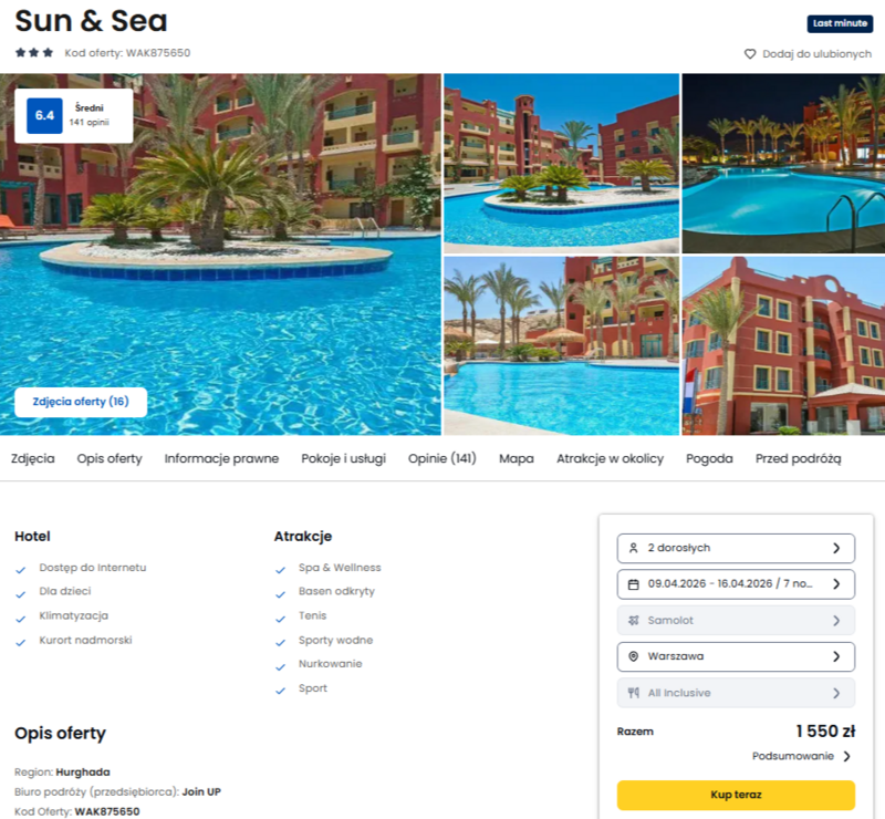 Wybór pada na hotel Sun & Sea, położony w samym sercu tętniącej życiem Hurghady. Obiekt cieszy się opinią miejsca o doskonałej lokalizacji, zaledwie kilkanaście minut spacerem od nowoczesnej dzielnicy Sakkala oraz piaszczystej plaży. Użytkownicy w swoich recenzjach często chwalą kameralną atmosferę, przestronne pokoje oraz baseny zewnętrzne wyposażone w zjeżdżalnie, które umilają wolny czas. W bliskim sąsiedztwie znajdują się liczne sklepiki z pamiątkami oraz klimatyczne kawiarnie, co pozwala poczuć autentyczny klimat Egiptu. Należy podkreślić, że ta wycieczka jest w opcji all inclusive, co zapewnia stały dostęp do posiłków w formie bufetu oraz lokalnych napojów bezalkoholowych i alkoholowych.