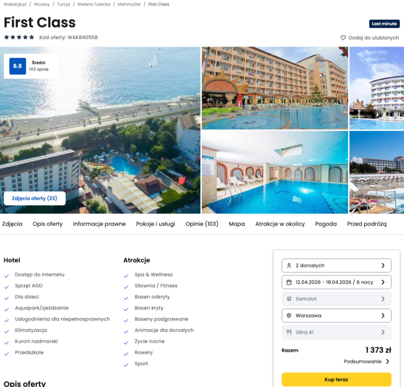 Użytkownicy w swoich opiniach doceniają szczególnie bardzo dobre jedzenie, miłą obsługę oraz przestronne pokoje, z których często roztacza się widok na morze. Wczasy w tym terminie to idealny moment na odwiedzenie Turcji, ponieważ pogoda sprzyja spacerom i zwiedzaniu okolicznych sklepików. Wiosenna aura na wybrzeżu jest wyjątkowo przyjemna, oferując dużo słońca i znacznie łagodniejsze temperatury niż w szczycie lata, co sprzyja korzystaniu z hotelowej strefy spa, sauny czy łaźni tureckiej. Dla najmłodszych przygotowano animacje, miniklub oraz plac zabaw, co czyni ofertę atrakcyjną dla całych rodzin.