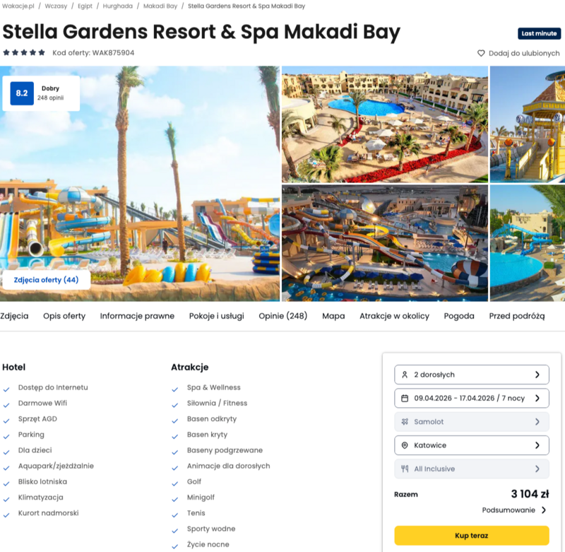 Użytkownicy w swoich opiniach chwalą hotel za przestronne pokoje oraz urozmaicone animacje. Rodziny z dziećmi szczególnie cenią miniklub oraz bezpłatny transport na piaszczystą plażę. Kwietniowe wczasy to idealny moment na wizytę w Egipcie. Pogoda w rejonie Hurghady jest wówczas bardzo przyjemna – temperatura powietrza oscyluje wokół 27 stopni Celsjusza, co sprzyja zarówno kąpielom, jak i zwiedzaniu okolicy. Całość dopełnia gościnna atmosfera oraz wysoki standard obsługi, typowy dla egipskich kurortów.