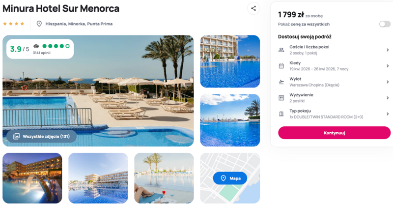 Wczasy w obiekcie Minura Hotel Sur Menorca to idealny wybór dla osób szukających relaksu w otoczeniu śródziemnomorskiej przyrody. Hotel cieszy się bardzo dobrymi opiniami gości, którzy doceniają wyjątkową czystość, niezwykle miłą obsługę oraz smaczne i urozmaicone posiłki. To miejsce przyjazne rodzinom, oferujące dostęp do fantastycznego parku wodnego, basenów ze zjeżdżalniami oraz licznych animacji.