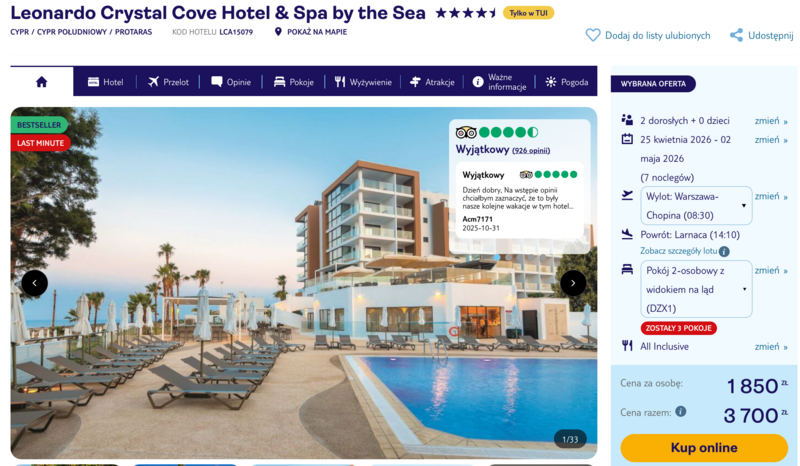 Ta wyjątkowa oferta pozwala na relaks w Leonardo Crystal Cove Hotel & Spa by the Sea, obiekcie przeznaczonym wyłącznie dla osób dorosłych. Na miejscu można liczyć na niezwykle profesjonalną obsługę oraz wyśmienite, urozmaicone posiłki. Goście w swoich opiniach zachwalają wieczory z muzyką na żywo oraz nienaganną czystość pokoi. Wczasy w tym miejscu są realizowane w formule all inclusive, co gwarantuje dostęp do pysznych drinków i tematycznych bufetów bez ograniczeń. Do dyspozycji oddano także nowoczesną strefę spa z jacuzzi oraz siłownię.