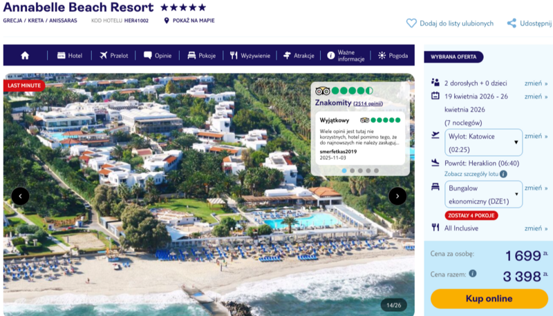 Te wyjątkowe wczasy pozwalają na relaks w pięciogwiazdkowym hotelu Annabelle Beach Resort, który zachwyca kaskadą bungalowów w tradycyjnym stylu egejskim oraz rozległym, pełnym zieleni ogrodem. Goście podkreślają w swoich opiniach niezwykle serdeczną, rodzinną atmosferę oraz profesjonalizm personelu, który dba o komfort każdego przyjezdnego. Wielkim atutem jest bogata oferta gastronomiczna, obejmująca pyszne owoce morza, grillowane warzywa i lokalne przysmaki, a wszystko to dostępne w wyjątkowo wygodnej formule all inclusive.
