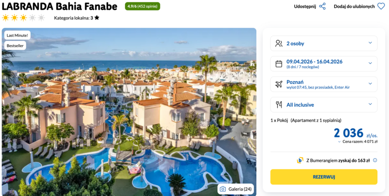 Ten wyjazd to idealna okazja, aby zaznać relaksu w malowniczym kurorcie Costa Adeje. Zakwaterowanie zaplanowano w kameralnym obiekcie LABRANDA Bahia Fanabe, który zachwyca niską zabudową w stylu kanaryjskim oraz greckim, otoczoną zadbanym ogrodem. Goście bardzo chwalą to miejsce za rodzinną atmosferę, smaczne, zróżnicowane posiłki oraz świetną lokalizację blisko piaszczystej plaży i tętniącej życiem promenady. Wypoczynek odbywa się w formule all inclusive, co gwarantuje pełen komfort bez martwienia się o codzienne wyżywienie czy napoje.