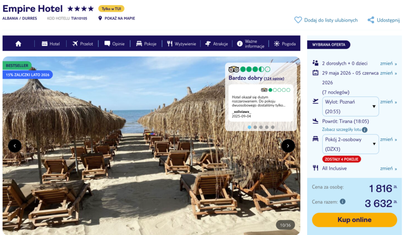 Wczasy w obiekcie Empire Hotel to doskonała okazja, aby poznać uroki okolicy Durrës i odpocząć w nowoczesnych, odnowionych wnętrzach. Goście szczególnie chwalą nienaganną czystość w pokojach oraz bardzo sprawne Wi-Fi, które ułatwia dzielenie się wspomnieniami z wyjazdu. Na miejscu dostępna jest komfortowa formuła all inclusive, obejmująca posiłki w formie bufetu oraz lokalne napoje. Dużym atutem jest basen usytuowany na dachu budynku, zapewniający relaks z wyjątkowym widokiem, a także prywatna, piaszczysta plaża z darmowymi leżakami i parasolami.