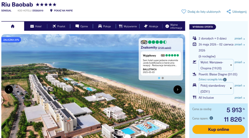 Odpoczynek zaplanowano w nowoczesnym, pięciogwiazdkowym hotelu Riu Baobab, położonym bezpośrednio przy piaszczystej plaży w Pointe Serene. Obiekt zachwyca rozbudowaną strefą basenową, nowoczesnym aquaparkiem oraz eleganckimi pokojami z widokiem na ocean. Goście mogą liczyć na pełen komfort, gdyż wyjazd realizowany jest w bogatej formule all inclusive, obejmującej wyśmienite bufety z kuchnią międzynarodową, restauracje tematyczne oraz nielimitowane napoje i przekąski przez całą dobę.