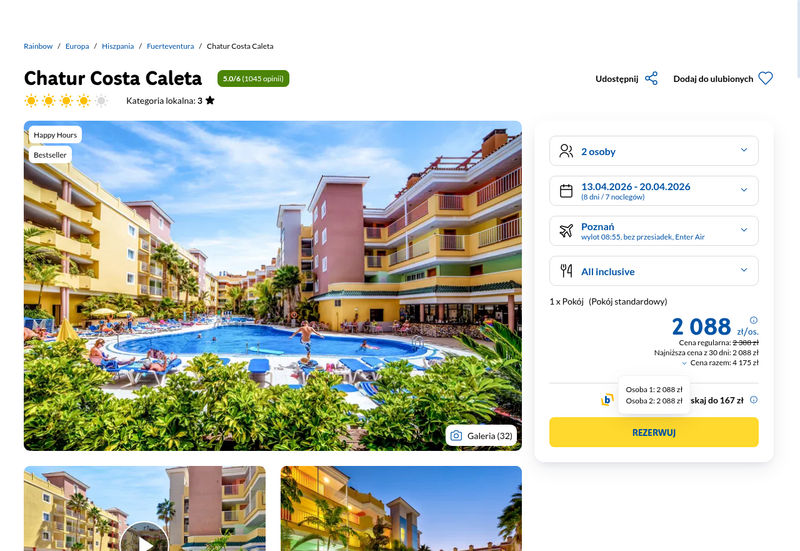 Wycieczka do Hiszpanii pozwala cieszyć się urokami miejscowości Caleta de Fuste, gdzie szeroka, zatokowa plaża zachęca do długich spacerów. Zakwaterowanie odbywa się w odświeżonym hotelu Chatur Costa Caleta, który zbiera świetne opinie dzięki wyjątkowej atmosferze oraz smacznym posiłkom serwowanym w bogatej opcji all inclusive. Uczestnicy wyjazdu podkreślają profesjonalizm obsługi oraz doskonałą strefę rekreacyjną z basenami, w tym specjalnym tarasem na dachu przeznaczonym wyłącznie dla dorosłych. W cenie pobytu zapewnia się pełne wyżywienie, lokalne napoje oraz szeroki program animacyjny obejmujący muzykę na żywo i ciekawe pokazy.